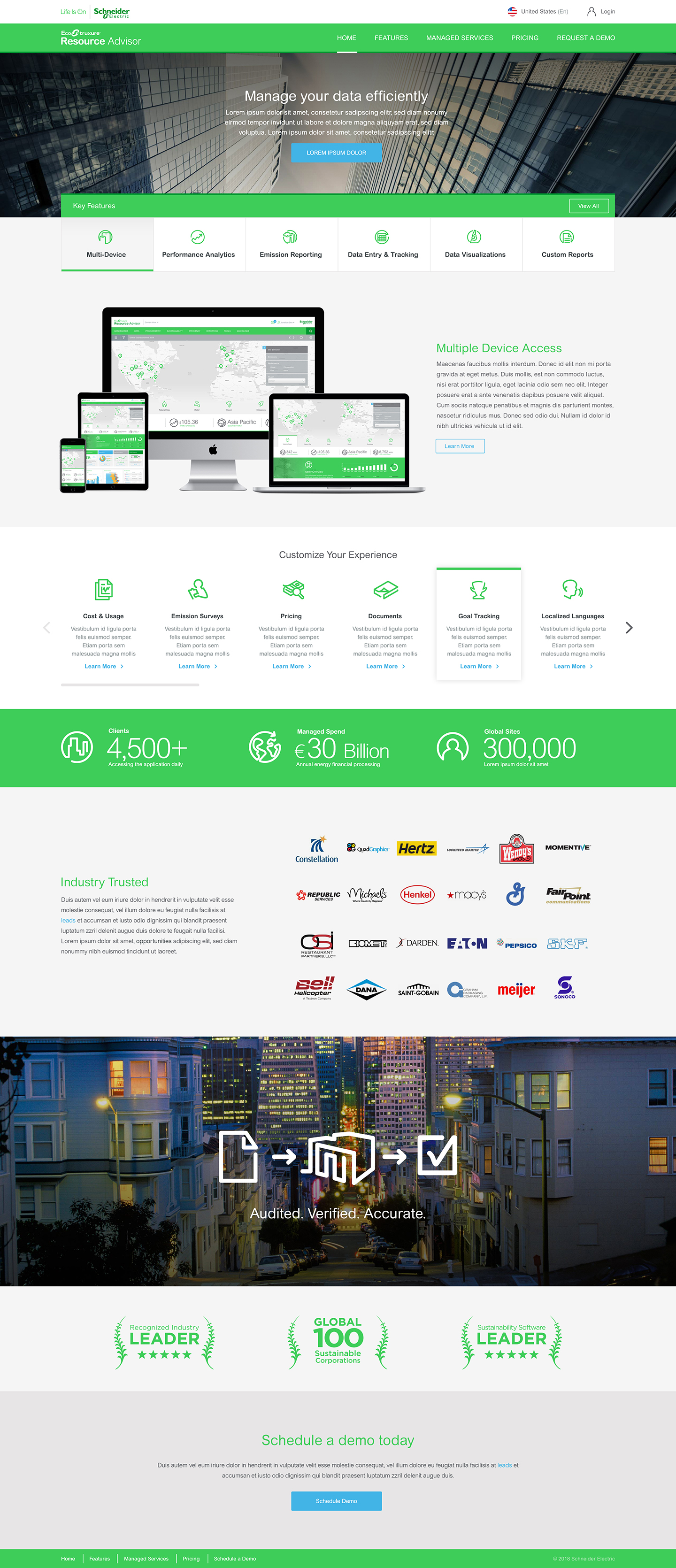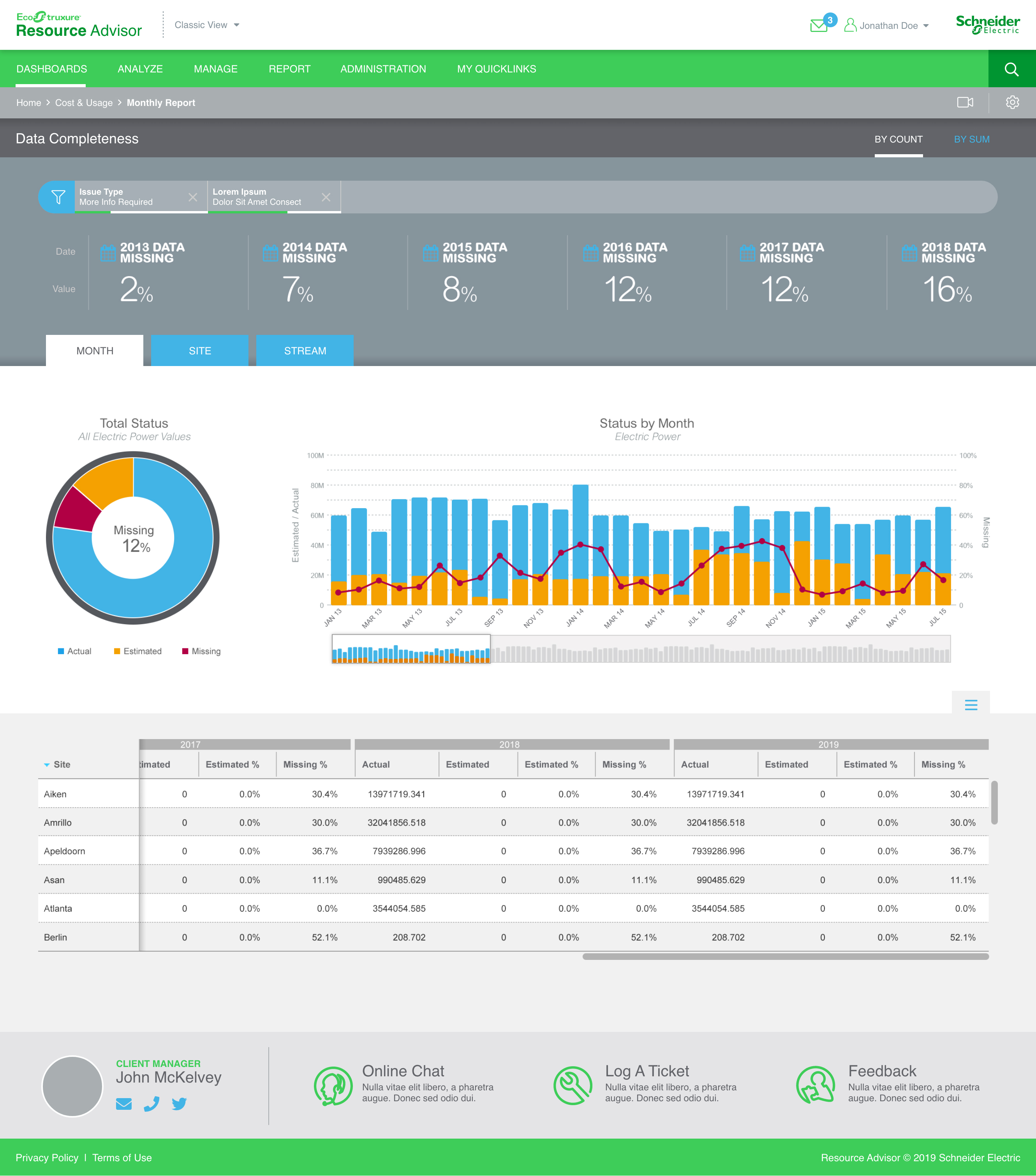 Schneider Electric’s Resource Advisor launched in 2005 with the title of DashboardView (DV) and contained a handful of simple reports that were selected from a single dropdown menu. All energy management services at the company were previously handled by individual account managers and delivered as PDFs to clients. These manual services and limited website still generated approximately $15 million annually for the company.