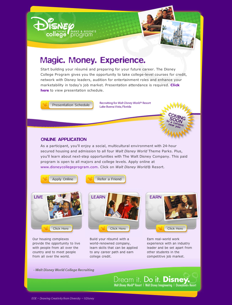 The end result was a campaign that exceeded metrics by as much as 300%. Applications tripled. Costs were substantially reduced. And the Disney College Program had metrics and a database of opt-ins to utilize for future marketing campaigns for other programs such as Disney Professional Internships.