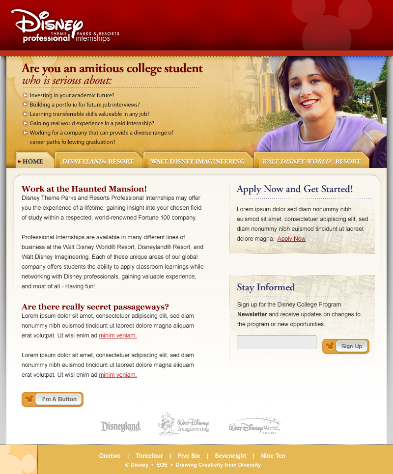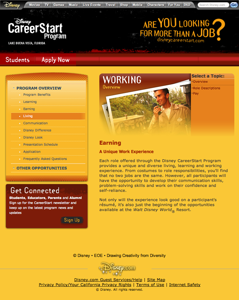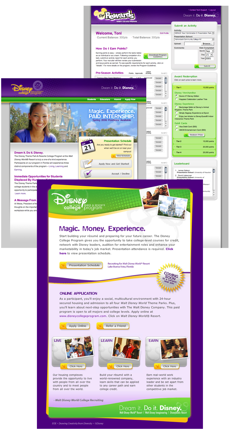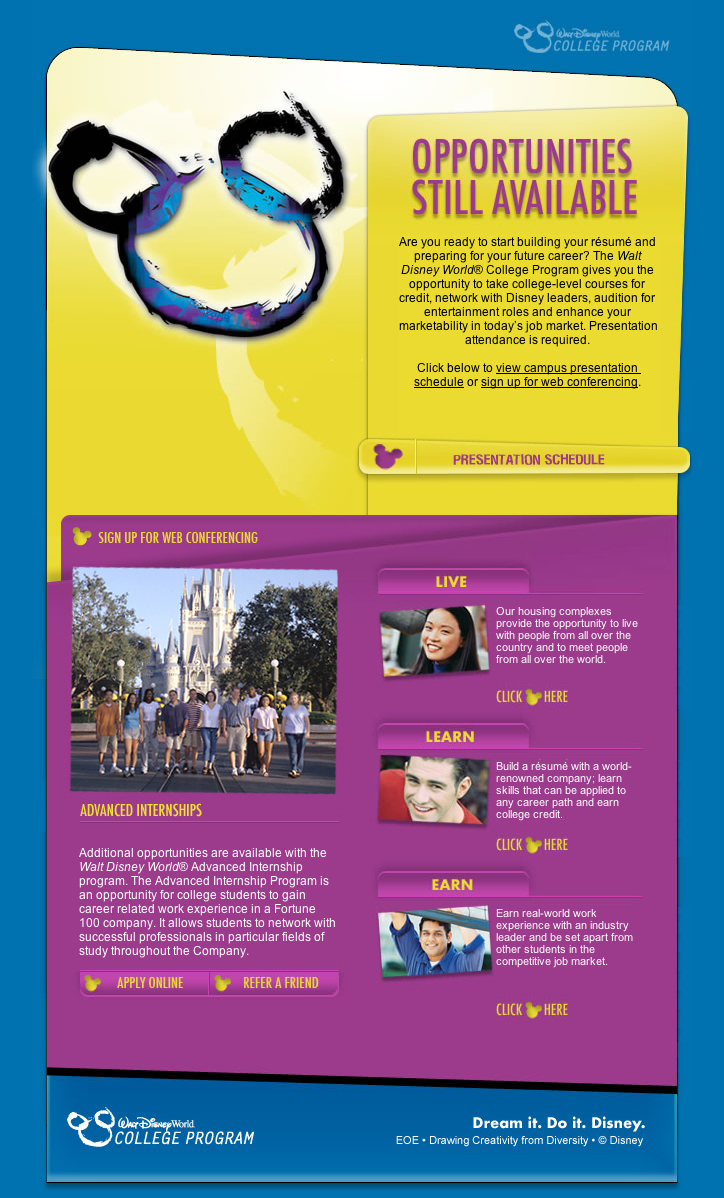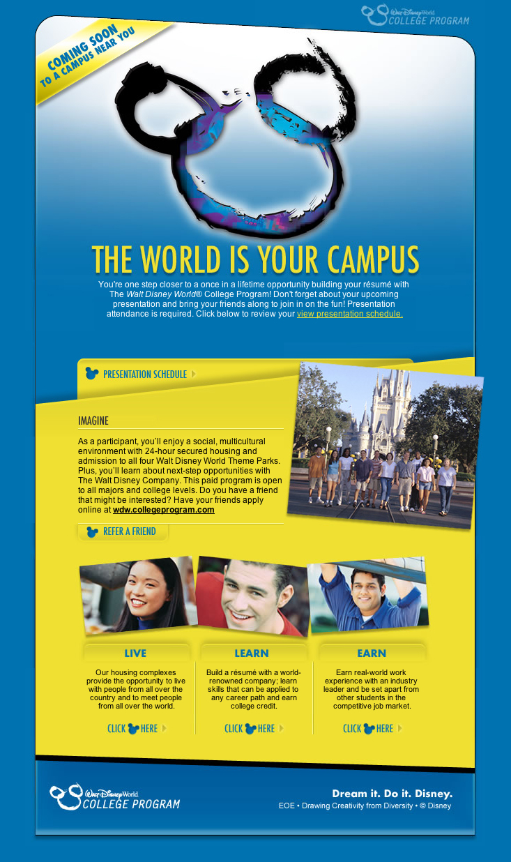 In 2006 the Walt Disney Company needed to transition from their print-and-mail college recruiting program to online tools. The cost per acquisition was too high, and growing, and the tracking metrics were extremely limited.